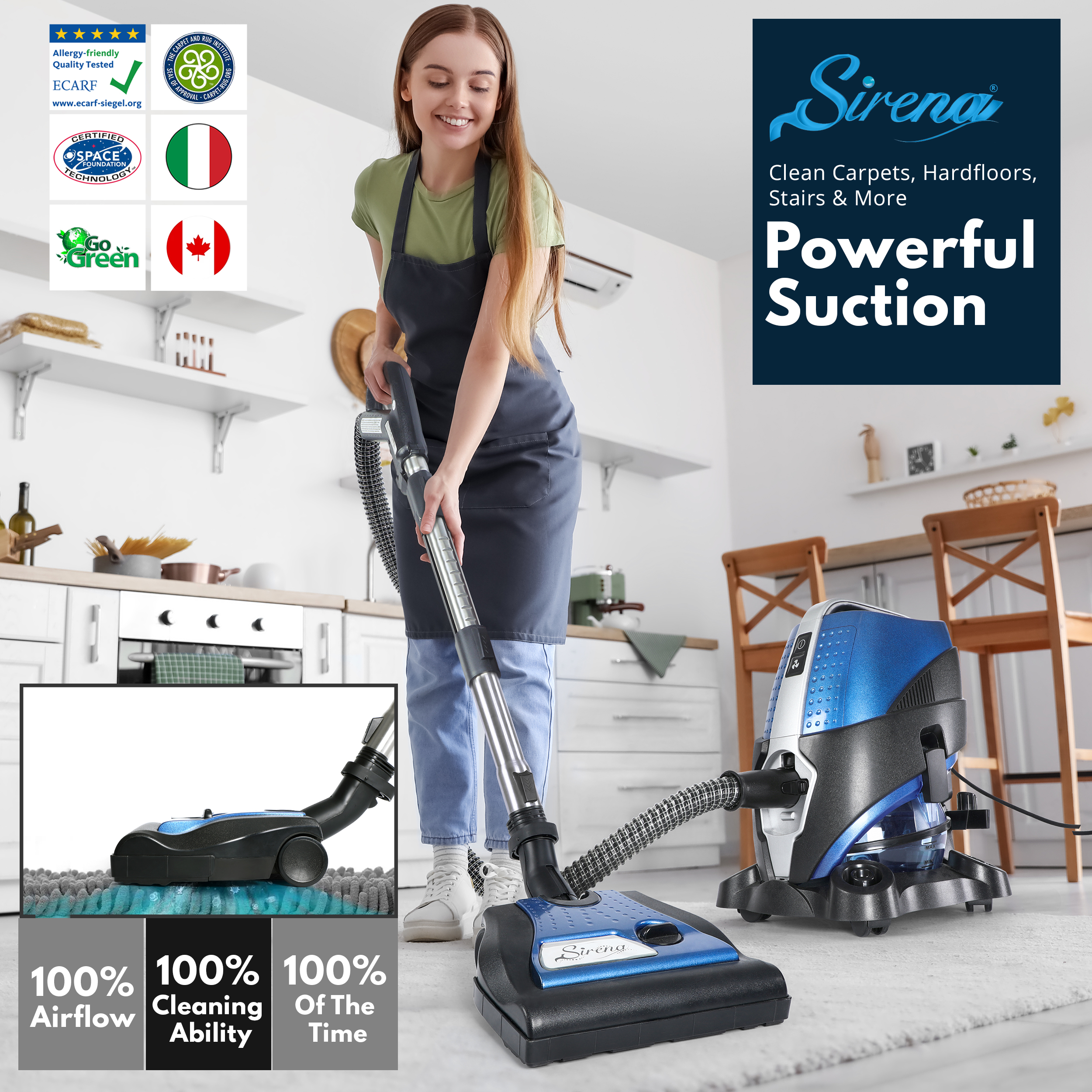 Consistent suction makes Sirena systems suitable for full-home cleaning sessions.
